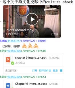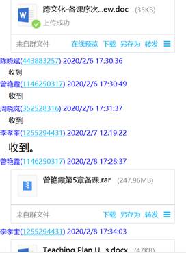 大量的网络资源使我们眼花缭乱,需要补充相应的视频解说、充分利用网上课程平台,为学生补充了MOOC资料《大学英语跨文化交际教程》等。备课组老师针对网课所必需资料的收集、上课可能出现的状况等,多次进行了qq群聊和视频、语音协商等。