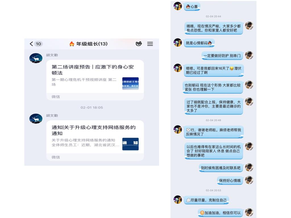 辅导员通过年级群、班长群、学务指导和班主任群、学生党员群、家长群等做好疫情防控的引导宣传工作,时时转发科学防疫注意事项以及相关工作通知。