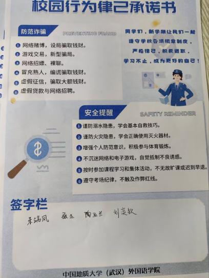 各班同学踊跃参与本次活动,校园律己行为承诺书发放到寝室后,同学们以寝室为单位进行承诺书的研读和学习探讨,明确了新学期学习生活律己要求,熟读每一条反诈提示与安全建议,进行了深入的反思与学习,并郑重的在承诺书签字栏处留下签名。