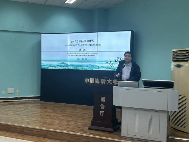 首先,杨红燕老师进行开场致辞,简要介绍了主讲人钟波教授,并对其到场表示了热烈的欢迎。讲座开始后,钟教授以自身高考经历为切入点,分享了他在地大的求学经历。通过不断探索和尝试,钟教授对生物医学逐渐产生了浓厚的兴趣。通过“七校联合办学”项目,钟教授参加了武汉大学生物科学专业的第二学位课程。大学毕业后,钟教授决定继续在生物医学领域深造,考取了武汉大学细胞生物学专业的研究生,师从中国科污污漫画