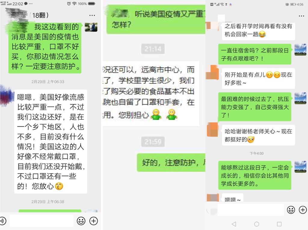 做汉语志愿者,在得知美国疫情加重之后,王老师经常与学生联系,提醒学生加强防护。杨红燕老师的一个学生整个寒假都留在学校,在疫情最紧张的时候杨老师一直与其保持联系,关注其生活是否有困难,鼓励她坚强成长。
