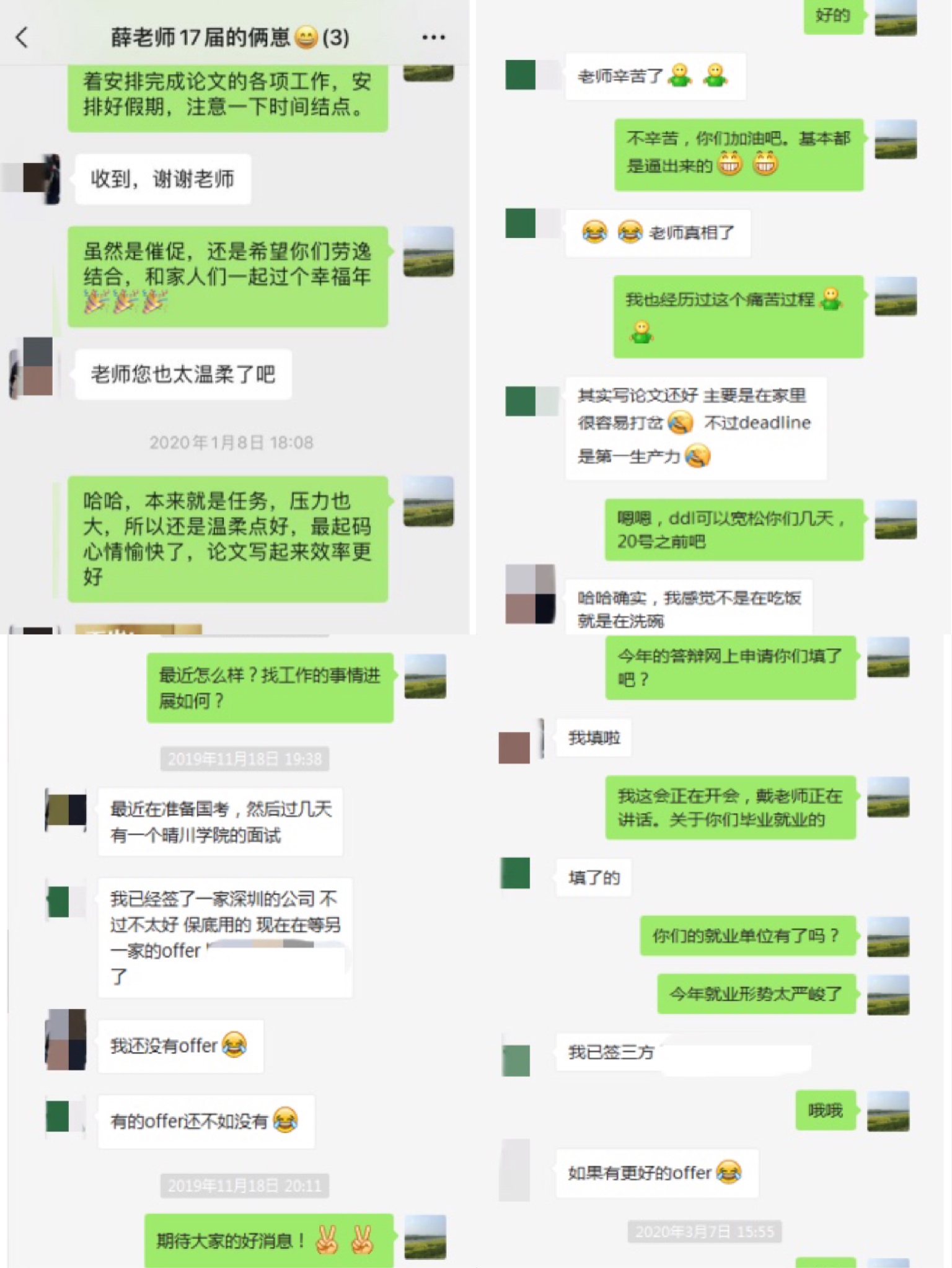 组织的网络双选会、空中宣讲会以及在线面试之外,导师们也都通过多种途径主动跟进毕业生就业意向、就业动态,不遗余力地寻找各类就业信息与途径,在自己有限的能力范围内尽最大可能帮助学生解决就业难题。王伟老师和汪卫红老师常在研究生群里发布专业相关招聘和培训信息。李孝奎老师通过电话与自己的研究生进行沟通,与研究生召开定期例会,就文献阅读,科研探索和实习实训等话题进行交流和指导。李老师今年的毕业研究生方同学面临着初步入职协议保底、签订意向协议、备战公务员考试等几种选择,目前疫情造成不少工作停滞,李老师在学生迷茫时常给予鼓励和建议。