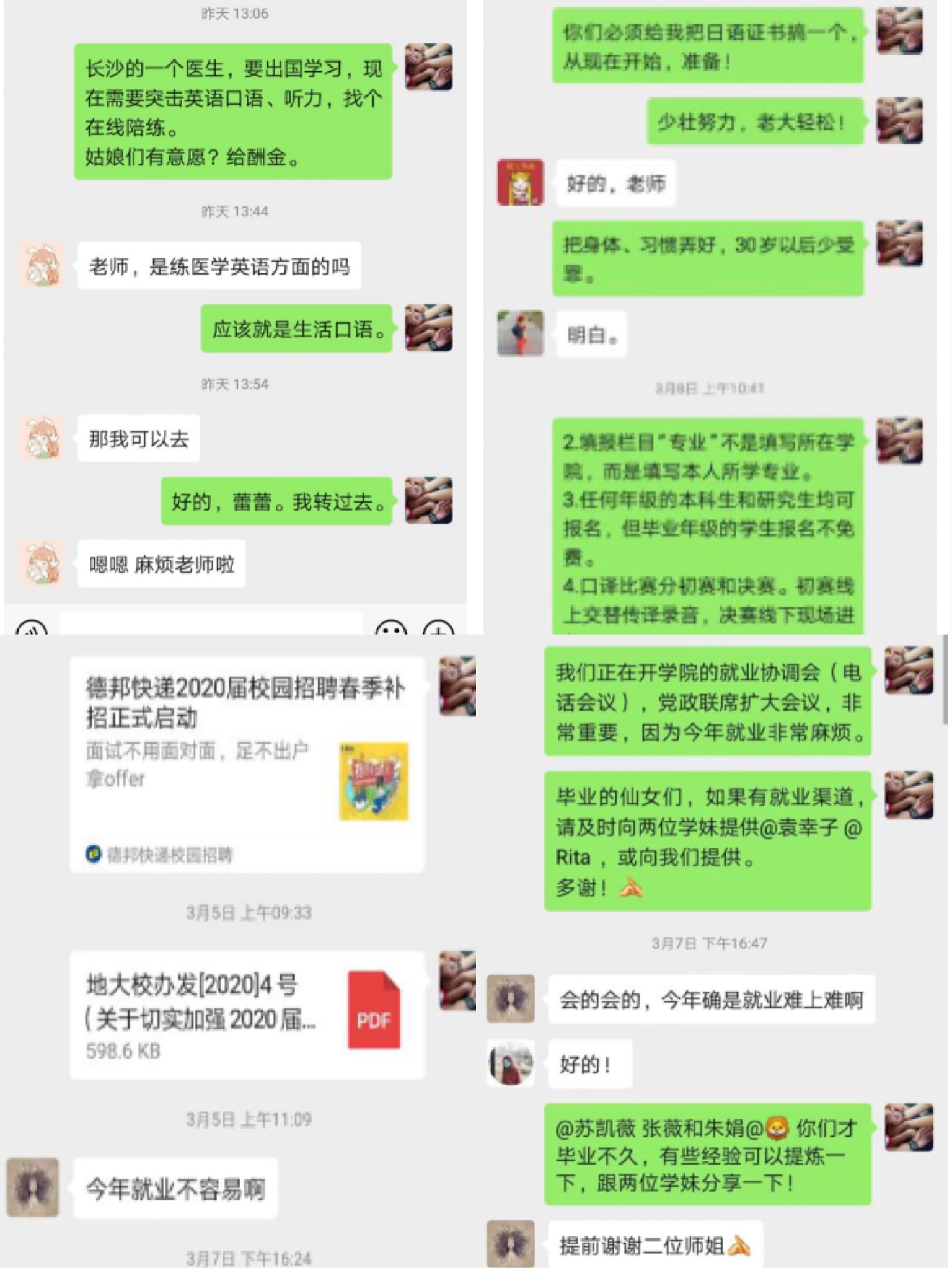 及时建立与疫情防控相适应的毕业生就业工作机制,号召全体教职员工调动一切资源和力量,深入了解和帮助学生,坚决打赢就业攻坚战。外院研究生导师们积极响应学校、污污漫画